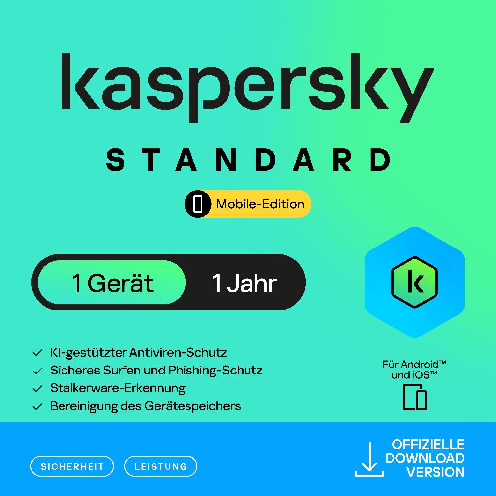 Kaspersky Standard – Mobile Edition – ausgezeichneter Schutz, der mit Ihnen Schritt hält. Die Lösung schützt Sie, Ihre Daten und Anwendungen mit Viren- und Phishing-Schutz, warnt Sie vor schwachen Geräteeinstellungen und erhöht mit speziellen Tools die Gerätegeschwindigkeit. Darüber hinaus bietet sie Standard-Funktionen zum Schutz der Privatsphäre, die Ihre Android-Kamera und Ihr Mikrofon schützen, die Sie warnen, wenn Ihre privaten Daten online weitergegeben werden, und die Spionage-Apps identifizieren, die ohne Ihr Wissen auf Ihrem Smartphone installiert wurden. Die Lösung funktioniert auf Android und iOS.  SICHERHEITSFUNKTIONEN Echtzeit-Virenschutz* erkennt und blockiert Bedrohungen wie Viren, Malware und Adware.  Phishing-Schutz verhindert, dass Sie von Betrügern auf Websites gelockt werden, die auf den Diebstahl Ihrer Daten und Bankinformationen abzielen.  Ransomware-Schutz* verhindert, dass Kriminelle die Kontrolle über Ihr mobiles Gerät und Ihre Daten übernehmen und für deren Freigabe Geld fordern.  „Sicherer Browser“-Funktion* schützt vor gefährlichen Webseiten und Downloads.  Weak-Settings-Scan-Funktion warnt vor schwachen Geräteeinstellungen, um Hacking-Angriffe zu verhindern.  FUNKTIONEN ZUR LEISTUNGSSTEIGERUNG App-Bereinigung-Funktion* befreit Ihr mobiles Gerät von Apps, die Sie selten oder nie verwenden, sodass Ihr Gerät schneller und reibungsloser läuft.  FUNKTIONEN ZUM SCHUTZ DER PRIVATSPHÄRE Datenleck-Überprüfungs-Funktion informiert Sie, wenn Online-Konten, die mit Ihrer E-Mail-Adresse verknüpft sind, persönliche Daten weitergeben.  Privatsphäre-Funktion organisiert Ihre Datenschutzeinstellungen in sozialen Medien und Online-Diensten wie Facebook und Google in einer zentralen, benutzerfreundlichen Oberfläche. So können Sie die gewünschten Einstellungen leichter finden, anpassen und verstärken.  Webcam- und Mikrofon-Schutzfunktion* lässt Sie selbst entscheiden, welche Programme auf Ihre Android-Webcam und Ihr Mikrofon zugreifen dürfen und blockiert alle anderen.  Stalkerware-Erkennung* warnt vor Apps, die ohne Ihr Wissen auf Ihrem Gerät installiert wurden, um Ihre Aktivitäten und Ihren Standort auszuspionieren.  „Wo ist mein Gerät“-Funktion* hilft Ihnen Ihr Gerät problemlos zu tracken, sperren und löschen, wenn es einmal abhandenkommen sollte.  * Nur AndroidTM |